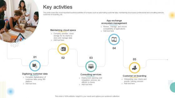 This slide covers the most important business activities of company such as automating customer data, maintaining cloud space, professional and consulting services, customer on boarding, etc. Get a simple yet stunning designed Key Activities Customer Engagement Platform Business Model BMC SS V. It is the best one to establish the tone in your meetings. It is an excellent way to make your presentations highly effective. So, download this PPT today from Slidegeeks and see the positive impacts. Our easy-to-edit Key Activities Customer Engagement Platform Business Model BMC SS V can be your go-to option for all upcoming conferences and meetings. So, what are you waiting for Grab this template today. This slide covers the most important business activities of company such as automating customer data, maintaining cloud space, professional and consulting services, customer on boarding, etc.