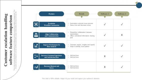 This slide includes the feature comparison of software used for customer escalation management. This includes various features such as workflow automation, align collaboration, decrease burnout, etc. Showcasing this set of slides titled Customer Escalation Handling Software Feature Comparison Designs Pdf The topics addressed in these templates are Workflow Automation, Improve Performance, Data Analysis All the content presented in this PPT design is completely editable. Download it and make adjustments in color, background, font etc. as per your unique business setting. This slide includes the feature comparison of software used for customer escalation management. This includes various features such as workflow automation, align collaboration, decrease burnout, etc.