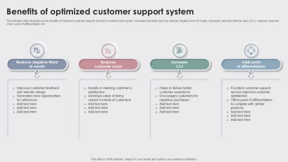 The following slide illustrates some benefits of improved customer support services to achieve team goals. It includes elements such as reduces negative word of mouth, increases customer lifetime value CLV, reduces customer churn, point of differentiation etc. Want to ace your presentation in front of a live audience Our Benefits Of Optimized Enhancing Customer Experience Ppt Powerpoint can help you do that by engaging all the users towards you. Slidegeeks experts have put their efforts and expertise into creating these impeccable powerpoint presentations so that you can communicate your ideas clearly. Moreover, all the templates are customizable, and easy-to-edit and downloadable. Use these for both personal and commercial use. The following slide illustrates some benefits of improved customer support services to achieve team goals. It includes elements such as reduces negative word of mouth, increases customer lifetime value CLV, reduces customer churn, point of differentiation etc.