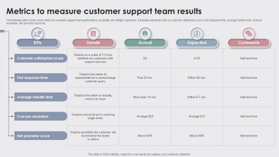 The following slide covers some metrics to evaluate support team performance constantly and delight customers. It includes elements such as customer satisfaction score, first response time, average handle time, cost per resolution, net promotor score etc. This Metrics To Measure Enhancing Customer Experience Ppt Example is perfect for any presentation, be it in front of clients or colleagues. It is a versatile and stylish solution for organizing your meetings. The Metrics To Measure Enhancing Customer Experience Ppt Example features a modern design for your presentation meetings. The adjustable and customizable slides provide unlimited possibilities for acing up your presentation. Slidegeeks has done all the homework before launching the product for you. So, do not wait, grab the presentation templates today The following slide covers some metrics to evaluate support team performance constantly and delight customers. It includes elements such as customer satisfaction score, first response time, average handle time, cost per resolution, net promotor score etc.