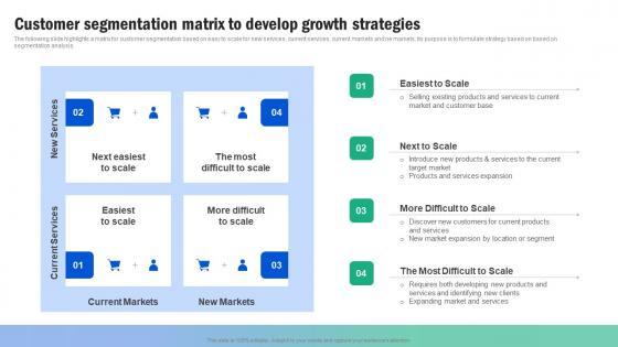 The following slide highlights a matrix for customer segmentation based on easy to scale for new services, current services, current markets and ne markets. Its purpose is to formulate strategy based on based on segmentation analysis. Do you know about Slidesgeeks Customer Segmentation Matrix To Develop Growth Strategies Ppt Summary Gallery PDF These are perfect for delivering any kind od presentation. Using it, create PowerPoint presentations that communicate your ideas and engage audiences. Save time and effort by using our pre designed presentation templates that are perfect for a wide range of topic. Our vast selection of designs covers a range of styles, from creative to business, and are all highly customizable and easy to edit. Download as a PowerPoint template or use them as Google Slides themes.
