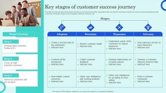 This slide provides glimpse about stages of customer success journey in the organization that can help the business to expand our customer base and retain good fit customers. It includes stages such as adoption, retention, advocacy, etc. Create an editable Implementing Client Onboarding Process Key Stages Of Customer Success Journey Themes PDF that communicates your idea and engages your audience. Whether you are presenting a business or an educational presentation, pre designed presentation templates help save time. Implementing Client Onboarding Process Key Stages Of Customer Success Journey Themes PDF is highly customizable and very easy to edit, covering many different styles from creative to business presentations. Slidegeeks has creative team members who have crafted amazing templates. So, go and get them without any delay.