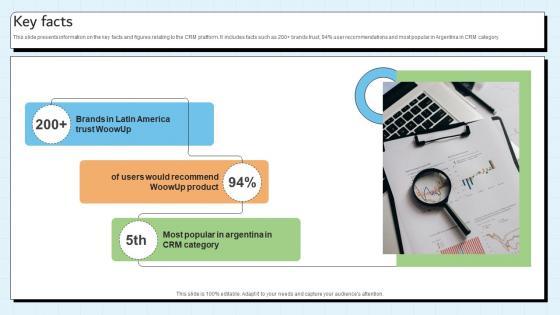 This slide presents information on the key facts and figures relating to the CRM platform. It includes facts such as 200 plus brands trust, 94percent user recommendations and most popular in Argentina in CRM category. If your project calls for a presentation, then Slidegeeks is your go-to partner because we have professionally designed, easy-to-edit templates that are perfect for any presentation. After downloading, you can easily edit Key Facts Customer Relationship Management Platform Pitch Deck and make the changes accordingly. You can rearrange slides or fill them with different images. Check out all the handy templates This slide presents information on the key facts and figures relating to the CRM platform. It includes facts such as 200 plus brands trust, 94percent user recommendations and most popular in Argentina in CRM category.