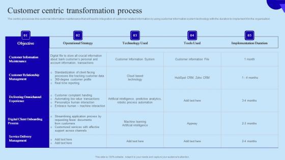 The centric processes like customer information maintenance that will lead to integration of customer related information by using customer information system technology with the duration to implement it in the organization. Get a simple yet stunning designed Customer Centric Transformation Process Organisational Digital Innovation Microsoft PDF. It is the best one to establish the tone in your meetings. It is an excellent way to make your presentations highly effective. So, download this PPT today from Slidegeeks and see the positive impacts. Our easy-to-edit Customer Centric Transformation Process Organisational Digital Innovation Microsoft PDF can be your go-to option for all upcoming conferences and meetings. So, what are you waiting for Grab this template today. The centric processes like customer information maintenance that will lead to integration of customer related information by using customer information system technology with the duration to implement it in the organization.