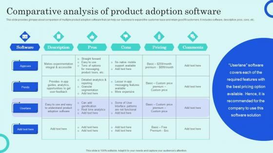 This slide provides glimpse about comparison of multiple product adoption software that can help our business to expand the customer base and retain good fit customers. It includes software, description, pros, cons, etc. Create an editable Comparative Analysis Of Product Adoption Overview Of Customer Adoption Process Structure Pdf that communicates your idea and engages your audience. Whether youre presenting a business or an educational presentation, pre designed presentation templates help save time. Comparative Analysis Of Product Adoption Overview Of Customer Adoption Process Structure Pdf is highly customizable and very easy to edit, covering many different styles from creative to business presentations. Slidegeeks has creative team members who have crafted amazing templates. So, go and get them without any delay. This slide provides glimpse about comparison of multiple product adoption software that can help our business to expand the customer base and retain good fit customers. It includes software, description, pros, cons, etc.