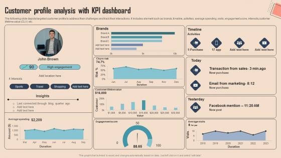 The following slide depicts targeted customer profile to address their challenges and track their interactions. It includes element such as brands, timeline, activities, average spending, visits, engagement score, interests, customer lifetime value CLV etc. The best PPT templates are a great way to save time, energy, and resources. Slidegeeks have 100 percent editable powerpoint slides making them incredibly versatile. With these quality presentation templates, you can create a captivating and memorable presentation by combining visually appealing slides and effectively communicating your message. Download Comprehensive Customer Data Platform Guide Optimizing Promotional Initiatives Customer Profile Analysis KPI Dashboard Pictures PDF from Slidegeeks and deliver a wonderful presentation.