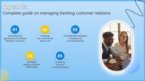 Want to ace your presentation in front of a live audience Our Agenda Complete Guide On Managing Banking Customer Relations Fin SS V can help you do that by engaging all the users towards you. Slidegeeks experts have put their efforts and expertise into creating these impeccable powerpoint presentations so that you can communicate your ideas clearly. Moreover, all the templates are customizable, and easy-to-edit and downloadable. Use these for both personal and commercial use. Our Agenda Complete Guide On Managing Banking Customer Relations Fin SS V are topically designed to provide an attractive backdrop to any subject. Use them to look like a presentation pro.