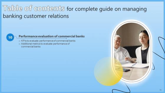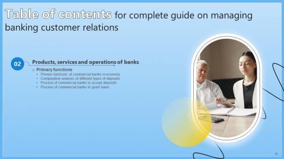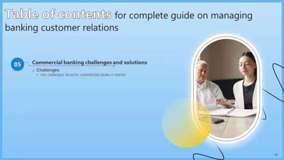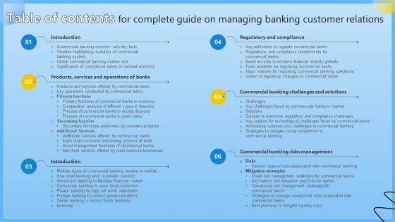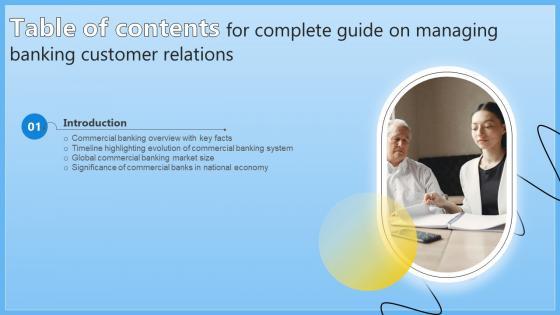 This Table Of Contents Complete Guide On Managing Banking Customer Relations Fin SS V from Slidegeeks makes it easy to present information on your topic with precision. It provides customization options, so you can make changes to the colors, design, graphics, or any other component to create a unique layout. It is also available for immediate download, so you can begin using it right away. Slidegeeks has done good research to ensure that you have everything you need to make your presentation stand out. Make a name out there for a brilliant performance. Our Table Of Contents Complete Guide On Managing Banking Customer Relations Fin SS V are topically designed to provide an attractive backdrop to any subject. Use them to look like a presentation pro.