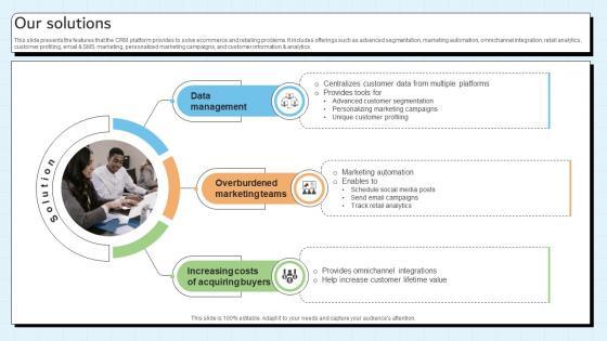 This slide presents the features that the CRM platform provides to solve ecommerce and retailing problems. It includes offerings such as advanced segmentation, marketing automation, omnichannel integration, retail analytics, customer profiling, email and SMS marketing, personalized marketing campaigns, and customer information and analytics. Make sure to capture your audiences attention in your business displays with our gratis customizable Our Solutions Customer Relationship Management Platform Pitch Deck. These are great for business strategies, office conferences, capital raising or task suggestions. If you desire to acquire more customers for your tech business and ensure they stay satisfied, create your own sales presentation with these plain slides. This slide presents the features that the CRM platform provides to solve ecommerce and retailing problems. It includes offerings such as advanced segmentation, marketing automation, omnichannel integration, retail analytics, customer profiling, email and SMS marketing, personalized marketing campaigns, and customer information and analytics.