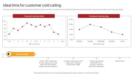 This slide highlights graphs that can help organization to determine ideal time and day for cold calling customers. Identifying ideal time for cold calling can help to increase the conversation sales of inside sales strategy. Make sure to capture your audiences attention in your business displays with our gratis customizable Remote Sales Plan For Ideal Time For Customer Cold Calling Strategy SS V. These are great for business strategies, office conferences, capital raising or task suggestions. If you desire to acquire more customers for your tech business and ensure they stay satisfied, create your own sales presentation with these plain slides. This slide highlights graphs that can help organization to determine ideal time and day for cold calling customers. Identifying ideal time for cold calling can help to increase the conversation sales of inside sales strategy.