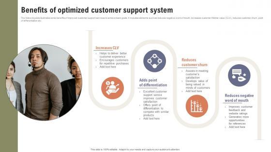 The following slide illustrates some benefits of improved customer support services to achieve team goals. It includes elements such as reduces negative word of mouth, increases customer lifetime value CLV, reduces customer churn, point of differentiation etc. Want to ace your presentation in front of a live audience Our Benefits Of Optimized Improving Customer Retention PPT PowerPoint can help you do that by engaging all the users towards you. Slidegeeks experts have put their efforts and expertise into creating these impeccable powerpoint presentations so that you can communicate your ideas clearly. Moreover, all the templates are customizable, and easy-to-edit and downloadable. Use these for both personal and commercial use. The following slide illustrates some benefits of improved customer support services to achieve team goals. It includes elements such as reduces negative word of mouth, increases customer lifetime value CLV, reduces customer churn, point of differentiation etc.