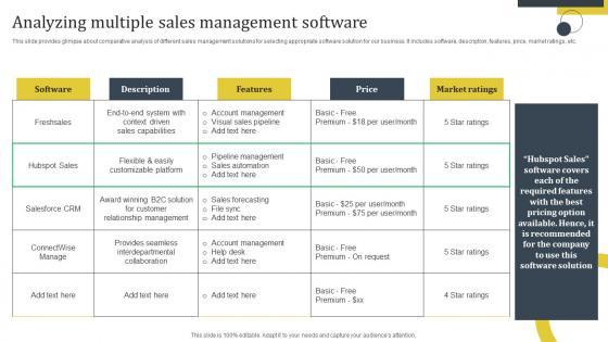 This slide provides glimpse about comparative analysis of different sales management solutions for selecting appropriate software solution for our business. It includes software, description, features, price, market ratings, etc. Slidegeeks is one of the best resources for PowerPoint templates. You can download easily and regulate Enhance Customer Retention Analyzing Multiple Sales Management Software Mockup Pdf for your personal presentations from our wonderful collection. A few clicks is all it takes to discover and get the most relevant and appropriate templates. Use our Templates to add a unique zing and appeal to your presentation and meetings. All the slides are easy to edit and you can use them even for advertisement purposes. This slide provides glimpse about comparative analysis of different sales management solutions for selecting appropriate software solution for our business. It includes software, description, features, price, market ratings, etc.