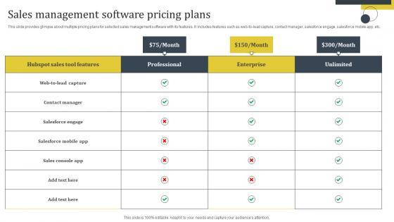 This slide provides glimpse about multiple pricing plans for selected sales management software with its features. It includes features such as web to lead capture, contact manager, salesforce engage, salesforce mobile app, etc. This Sales Management Software Effective Sales Strategy To Enhance Customer Retention Formats Pdf from Slidegeeks makes it easy to present information on your topic with precision. It provides customization options, so you can make changes to the colors, design, graphics, or any other component to create a unique layout. It is also available for immediate download, so you can begin using it right away. Slidegeeks has done good research to ensure that you have everything you need to make your presentation stand out. Make a name out there for a brilliant performance. This slide provides glimpse about multiple pricing plans for selected sales management software with its features. It includes features such as web to lead capture, contact manager, salesforce engage, salesforce mobile app, etc.