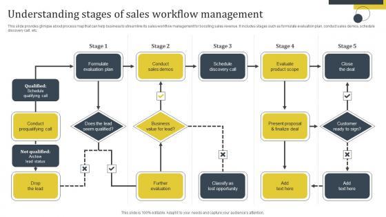 This slide provides glimpse about process map that can help business to streamline its sales workflow management for boosting sales revenue. It includes stages such as formulate evaluation plan, conduct sales demos, schedule discovery call, etc. Slidegeeks is one of the best resources for PowerPoint templates. You can download easily and regulate Enhance Customer Retention Understanding Stages Of Sales Workflow Management Sample Pdf for your personal presentations from our wonderful collection. A few clicks is all it takes to discover and get the most relevant and appropriate templates. Use our Templates to add a unique zing and appeal to your presentation and meetings. All the slides are easy to edit and you can use them even for advertisement purposes. This slide provides glimpse about process map that can help business to streamline its sales workflow management for boosting sales revenue. It includes stages such as formulate evaluation plan, conduct sales demos, schedule discovery call, etc.