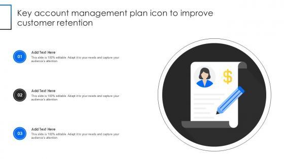 Persuade your audience using this Key Account Management Plan Icon To Improve Customer Retention Ideas PDF. This PPT design covers three stages, thus making it a great tool to use. It also caters to a variety of topics including Key Account, Management Plan, Improve Customer Retention. Download this PPT design now to present a convincing pitch that not only emphasizes the topic but also showcases your presentation skills.