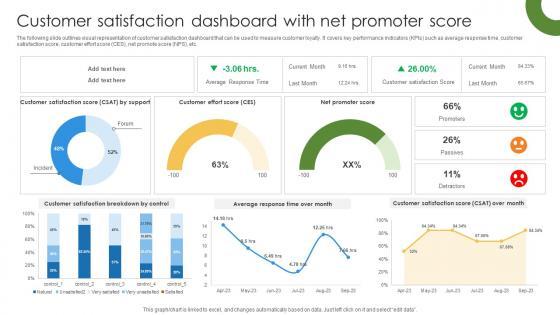 The following slide outlines visual representation of customer satisfaction dashboard that can be used to measure customer loyalty. It covers key performance indicators KPIs such as average response time, customer satisfaction score, customer effort score CES, net promote score NPS, etc. Get a simple yet stunning designed Marketing Growth Strategy Customer Satisfaction Dashboard With Net Promoter Strategy SS V. It is the best one to establish the tone in your meetings. It is an excellent way to make your presentations highly effective. So, download this PPT today from Slidegeeks and see the positive impacts. Our easy-to-edit Marketing Growth Strategy Customer Satisfaction Dashboard With Net Promoter Strategy SS V can be your go-to option for all upcoming conferences and meetings. So, what are you waiting for Grab this template today. The following slide outlines visual representation of customer satisfaction dashboard that can be used to measure customer loyalty. It covers key performance indicators KPIs such as average response time, customer satisfaction score, customer effort score CES, net promote score NPS, etc.