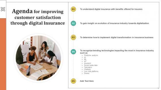 Find a pre-designed and impeccable Agenda For Improving Customer Satisfaction Through Digital Insurance. The templates can ace your presentation without additional effort. You can download these easy-to-edit presentation templates to make your presentation stand out from others. So, what are you waiting for Download the template from Slidegeeks today and give a unique touch to your presentation. Our Agenda For Improving Customer Satisfaction Through Digital Insurance are topically designed to provide an attractive backdrop to any subject. Use them to look like a presentation pro.