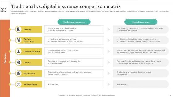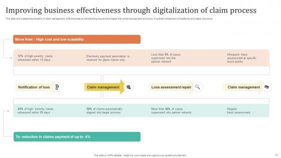 This slide showcases maximization of claim management effectiveness by transforming insurance to digital that enhances payment accuracy. It outlines comparison of traditional and digital insurance. Retrieve professionally designed Improving Customer Satisfaction Improving Business Effectiveness Through Digitalization to effectively convey your message and captivate your listeners. Save time by selecting pre-made slideshows that are appropriate for various topics, from business to educational purposes. These themes come in many different styles, from creative to corporate, and all of them are easily adjustable and can be edited quickly. Access them as PowerPoint templates or as Google Slides themes. You do not have to go on a hunt for the perfect presentation because Slidegeeks got you covered from everywhere. This slide showcases maximization of claim management effectiveness by transforming insurance to digital that enhances payment accuracy. It outlines comparison of traditional and digital insurance.