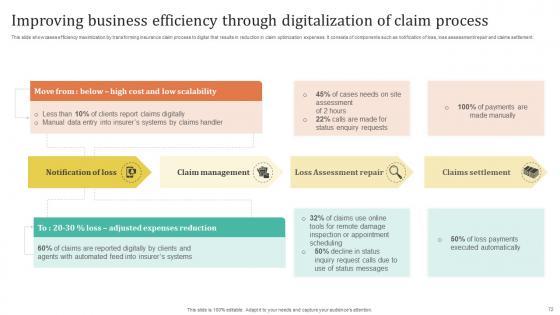 This slide showcases efficiency maximization by transforming insurance claim process to digital that results in reduction in claim optimization expenses. It consists of components such as notification of loss, loss assessment repair and claims settlement. Slidegeeks has constructed Improving Customer Satisfaction Improving Business Efficiency Through Digitalization after conducting extensive research and examination. These presentation templates are constantly being generated and modified based on user preferences and critiques from editors. Here, you will find the most attractive templates for a range of purposes while taking into account ratings and remarks from users regarding the content. This is an excellent jumping-off point to explore our content and will give new users an insight into our top-notch PowerPoint Templates. This slide showcases efficiency maximization by transforming insurance claim process to digital that results in reduction in claim optimization expenses. It consists of components such as notification of loss, loss assessment repair and claims settlement.