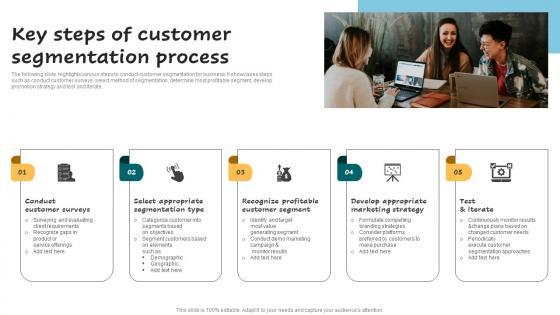 The following slide highlights various steps to conduct customer segmentation for business. It showcases steps such as conduct customer surveys, select method of segmentation, determine most profitable segment, develop promotion strategy and test and iterate. Take your projects to the next level with our ultimate collection of Key Steps Of Customer Segmentation Process Successful Guide For Market Segmentation Mockup Pdf. Slidegeeks has designed a range of layouts that are perfect for representing task or activity duration, keeping track of all your deadlines at a glance. Tailor these designs to your exact needs and give them a truly corporate look with your own brand colors they well make your projects stand out from the rest. The following slide highlights various steps to conduct customer segmentation for business. It showcases steps such as conduct customer surveys, select method of segmentation, determine most profitable segment, develop promotion strategy and test and iterate.