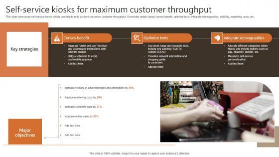 This slide showcases self-service kiosks which can help brands achieve maximum customer throughput. It provides details about convey benefit, optimize texts, integrate demographics, visibility, marketing costs, etc. Get a simple yet stunning designed Self Service Kiosks For Maximum Customer Experiential Marketing Technique Graphics PDF. It is the best one to establish the tone in your meetings. It is an excellent way to make your presentations highly effective. So, download this PPT today from Slidegeeks and see the positive impacts. Our easy-to-edit Self Service Kiosks For Maximum Customer Experiential Marketing Technique Graphics PDF can be your go-to option for all upcoming conferences and meetings. So, what are you waiting for Grab this template today. This slide showcases self-service kiosks which can help brands achieve maximum customer throughput. It provides details about convey benefit, optimize texts, integrate demographics, visibility, marketing costs, etc.