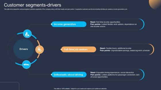 This slide showcases the various targeted customer segments of the company along with their needs and pain points. It segments customers as drivers including full-time job seekers, income generators, etc. Want to ace your presentation in front of a live audience Our Customer Segments Drivers Platform As A Service Paas Business Model BMC SS V can help you do that by engaging all the users towards you. Slidegeeks experts have put their efforts and expertise into creating these impeccable powerpoint presentations so that you can communicate your ideas clearly. Moreover, all the templates are customizable, and easy-to-edit and downloadable. Use these for both personal and commercial use. This slide showcases the various targeted customer segments of the company along with their needs and pain points. It segments customers as drivers including full-time job seekers, income generators, etc.