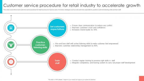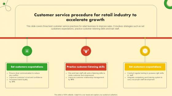 This slide covers three best customer service practices for retail business to improve sales. It involves strategies such as set customers expectations, practice customer listening skills and train staff. Slidegeeks is here to make your presentations a breeze with Implementing Strategies To Enhance Customer Service Procedure For Retail Industry To Accelerate With our easy-to-use and customizable templates, you can focus on delivering your ideas rather than worrying about formatting. With a variety of designs to choose from, you are sure to find one that suits your needs. And with animations and unique photos, illustrations, and fonts, you can make your presentation pop. So whether you are giving a sales pitch or presenting to the board, make sure to check out Slidegeeks first This slide covers three best customer service practices for retail business to improve sales. It involves strategies such as set customers expectations, practice customer listening skills and train staff.