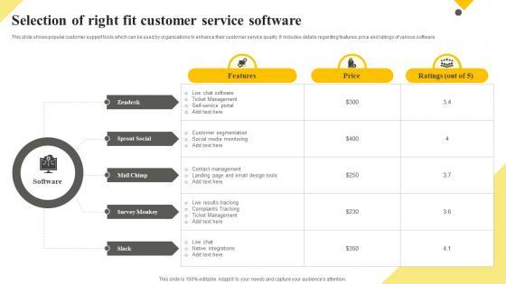 This slide shows popular customer support tools which can be used by organizations to enhance their customer service quality. It includes details regarding features, price and ratings of various software. This Client Support Plan To Increase Customer Selection Of Right Fit Customer Service Software Strategy SS V is perfect for any presentation, be it in front of clients or colleagues. It is a versatile and stylish solution for organizing your meetings. The Client Support Plan To Increase Customer Selection Of Right Fit Customer Service Software Strategy SS V features a modern design for your presentation meetings. The adjustable and customizable slides provide unlimited possibilities for acing up your presentation. Slidegeeks has done all the homework before launching the product for you. So, do not wait, grab the presentation templates today This slide shows popular customer support tools which can be used by organizations to enhance their customer service quality. It includes details regarding features, price and ratings of various software.