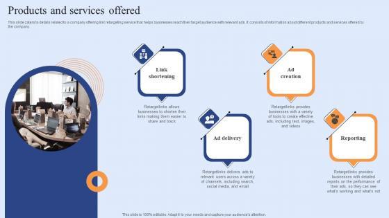 This slide caters to details related to a company offering link retargeting service that helps businesses reach their target audience with relevant ads. It consists of information about different products and services offered by the company. There are so many reasons you need a Products And Services Offered Funding Elevator Pitch Deck For Customer Retention Software Grid Pdf. The first reason is you can not spend time making everything from scratch, Thus, Slidegeeks has made presentation templates for you too. You can easily download these templates from our website easily. This slide caters to details related to a company offering link retargeting service that helps businesses reach their target audience with relevant ads. It consists of information about different products and services offered by the company.