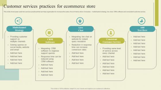 This slide showcases customer services practices that can help organization to increase the sales of ecommerce store. It includes multichannel strategy, live shat, CRM software and consistent customer service. If your project calls for a presentation, then Slidegeeks is your go-to partner because we have professionally designed, easy-to-edit templates that are perfect for any presentation. After downloading, you can easily edit Successful Guide For Ecommerce Promotion Customer Services Practices For Ecommerce Designs Pdf and make the changes accordingly. You can rearrange slides or fill them with different images. Check out all the handy templates This slide showcases customer services practices that can help organization to increase the sales of ecommerce store. It includes multichannel strategy, live shat, CRM software and consistent customer service.