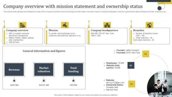This slide provides glimpse about detailed summary of the company to provide current and background information. It includes mission, company headquarters, branches, general information and figures, founder, employees, etc. Present like a pro with Enhance Customer Retention Company Overview With Mission Statement Portrait Pdf Create beautiful presentations together with your team, using our easy-to-use presentation slides. Share your ideas in real-time and make changes on the fly by downloading our templates. So whether you are in the office, on the go, or in a remote location, you can stay in sync with your team and present your ideas with confidence. With Slidegeeks presentation got a whole lot easier. Grab these presentations today. This slide provides glimpse about detailed summary of the company to provide current and background information. It includes mission, company headquarters, branches, general information and figures, founder, employees, etc.