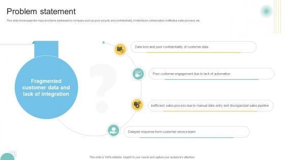 This slide showcases the major problems addressed by company such as poor security and confidentiality, limited team collaboration, ineffective sales process, etc. Whether you have daily or monthly meetings, a brilliant presentation is necessary. Problem Statement Customer Engagement Platform Business Model BMC SS V can be your best option for delivering a presentation. Represent everything in detail using Problem Statement Customer Engagement Platform Business Model BMC SS V and make yourself stand out in meetings. The template is versatile and follows a structure that will cater to your requirements. All the templates prepared by Slidegeeks are easy to download and edit. Our research experts have taken care of the corporate themes as well. So, give it a try and see the results. This slide showcases the major problems addressed by company such as poor security and confidentiality, limited team collaboration, ineffective sales process, etc.