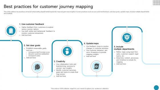 This slide outlines key practices aimed at collaborating departmental inputs into map and gain new insights. It covers practices such as use customer feedback, set clear goals, update maps, include multiple departments and creativity Want to ace your presentation in front of a live audience Our Best Practices For Customer Journey Mapping Driving Business Success Integrating Product can help you do that by engaging all the users towards you. Slidegeeks experts have put their efforts and expertise into creating these impeccable powerpoint presentations so that you can communicate your ideas clearly. Moreover, all the templates are customizable, and easy-to-edit and downloadable. Use these for both personal and commercial use. This slide outlines key practices aimed at collaborating departmental inputs into map and gain new insights. It covers practices such as use customer feedback, set clear goals, update maps, include multiple departments and creativity