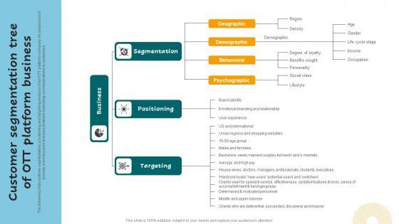 The following slide outlines segmentation, positioning and targeting analysis of an OTT platform company. Its purpose is to provide more focused and personalized marketing communications to customers. Slidegeeks is here to make your presentations a breeze with Customer Segmentation Tree Of OTT Platform Successful Guide For Market Segmentation Mockup Pdf With our easy-to-use and customizable templates, you can focus on delivering your ideas rather than worrying about formatting. With a variety of designs to choose from, you are sure to find one that suits your needs. And with animations and unique photos, illustrations, and fonts, you can make your presentation pop. So whether you are giving a sales pitch or presenting to the board, make sure to check out Slidegeeks first. The following slide outlines segmentation, positioning and targeting analysis of an OTT platform company. Its purpose is to provide more focused and personalized marketing communications to customers.