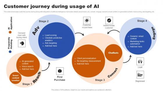 This slide showcases customer journey during along with integration of artificial intelligence. It provides details about reach, act, convert, engage, dynamic email content, AI-generated content, lead scoring, ads targeting, etc. Create an editable Customer Journey During Usage Of AI Ppt Layouts Brochure PDF that communicates your idea and engages your audience. Whether you are presenting a business or an educational presentation, pre-designed presentation templates help save time. Customer Journey During Usage Of AI Ppt Layouts Brochure PDF is highly customizable and very easy to edit, covering many different styles from creative to business presentations. Slidegeeks has creative team members who have crafted amazing templates. So, go and get them without any delay.
