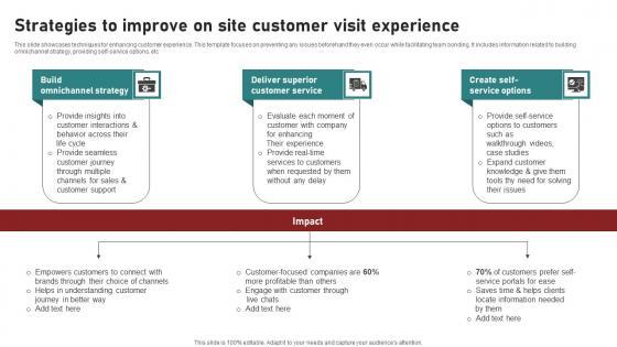 This slide showcases techniques for enhancing customer experience. This template focuses on preventing any issues beforehand they even occur while facilitating team bonding. It includes information related to building omnichannel strategy, providing self-service options, etc. Showcasing this set of slides titled Strategies To Improve On Site Customer Visit Experience Ppt Gallery Layout pdf. The topics addressed in these templates are Build Omni, Channel Strategy, Deliver Superior. All the content presented in this PPT design is completely editable. Download it and make adjustments in color, background, font etc. as per your unique business setting. This slide showcases techniques for enhancing customer experience. This template focuses on preventing any issues beforehand they even occur while facilitating team bonding. It includes information related to building omnichannel strategy, providing self-service options, etc.