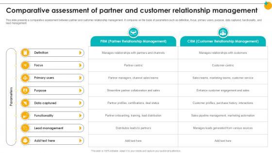 This slide presents a comparative assessment between partner and customer relationship management. It compares on the basis of parameters such as definition, focus, primary users, purpose, data captured, functionality, and lead management. Are you in need of a template that can accommodate all of your creative concepts This one is crafted professionally and can be altered to fit any style. Use it with Google Slides or PowerPoint. Include striking photographs, symbols, depictions, and other visuals. Fill, move around, or remove text boxes as desired. Test out color palettes and font mixtures. Edit and save your work, or work with colleagues. Download Comparative Assessment Of Partner And Customer Partner Relationship Ppt Example and observe how to make your presentation outstanding. Give an impeccable presentation to your group and make your presentation unforgettable. This slide presents a comparative assessment between partner and customer relationship management. It compares on the basis of parameters such as definition, focus, primary users, purpose, data captured, functionality, and lead management.