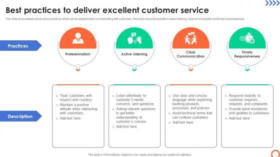 This slide shows details about various practices which can be adopted by bank representatives while communicating with customers. These tips are professionalism, active listening, clear communication and timely responsiveness. Do you have an important presentation coming up Are you looking for something that will make your presentation stand out from the rest Look no further than Best Practices To Provide Excellent Customer Service Complete Guide On Managing Banking Fin SS V. With our professional designs, you can trust that your presentation will pop and make delivering it a smooth process. And with Slidegeeks, you can trust that your presentation will be unique and memorable. So why wait Grab Best Practices To Provide Excellent Customer Service Complete Guide On Managing Banking Fin SS V today and make your presentation stand out from the rest This slide shows details about various practices which can be adopted by bank representatives while communicating with customers. These tips are professionalism, active listening, clear communication and timely responsiveness.