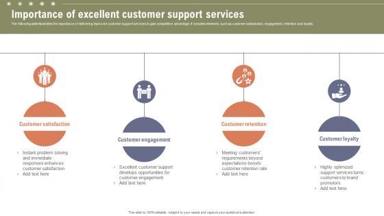 The following slide illustrates the importance of delivering improved customer support services to gain competitive advantage. It includes elements such as customer satisfaction, engagement, retention and loyalty. Make sure to capture your audiences attention in your business displays with our gratis customizable Importance Of Excellent Improving Customer Retention PPT PowerPoint. These are great for business strategies, office conferences, capital raising or task suggestions. If you desire to acquire more customers for your tech business and ensure they stay satisfied, create your own sales presentation with these plain slides. The following slide illustrates the importance of delivering improved customer support services to gain competitive advantage. It includes elements such as customer satisfaction, engagement, retention and loyalty.