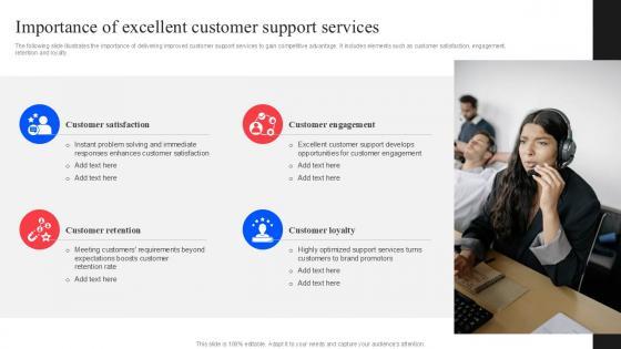 The following slide illustrates the importance of delivering improved customer support services to gain competitive advantage. It includes elements such as customer satisfaction, engagement, retention and loyalty. Make sure to capture your audiences attention in your business displays with our gratis customizable Importance Of Excellent Enhancing Customer Experience Ppt Template. These are great for business strategies, office conferences, capital raising or task suggestions. If you desire to acquire more customers for your tech business and ensure they stay satisfied, create your own sales presentation with these plain slides. The following slide illustrates the importance of delivering improved customer support services to gain competitive advantage. It includes elements such as customer satisfaction, engagement, retention and loyalty.
