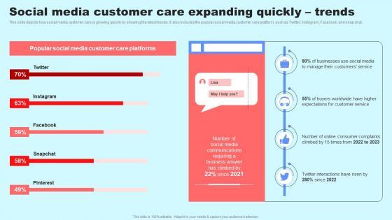 This slide depicts how social media customer care is growing quickly by showing the latest trends. It also includes the popular social media customer care platform, such as Twitter, Instagram, Facebook, and snap chat. Here you can discover an assortment of the finest PowerPoint and Google Slides templates. With these templates, you can create presentations for a variety of purposes while simultaneously providing your audience with an eye catching visual experience. Download Social Media In Customer Support Social Media Customer Care Expanding Quickly Trends Template Pdf to deliver an impeccable presentation. These templates will make your job of preparing presentations much quicker, yet still, maintain a high level of quality. Slidegeeks has experienced researchers who prepare these templates and write high quality content for you. Later on, you can personalize the content by editing the Social Media In Customer Support Social Media Customer Care Expanding Quickly Trends Template Pdf. This slide depicts how social media customer care is growing quickly by showing the latest trends. It also includes the popular social media customer care platform, such as Twitter, Instagram, Facebook, and snap chat.