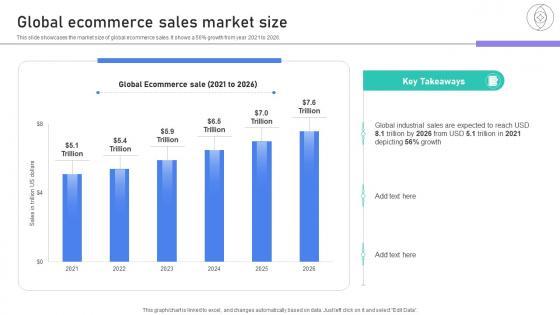 This slide showcases the market size of global ecommerce sales. It shows a 56 percent growth from year 2021 to 2026. Crafting an eye-catching presentation has never been more straightforward. Let your presentation shine with this tasteful yet straightforward Building Stronger Customer Global Ecommerce Sales Market Size SA SS V template. It offers a minimalistic and classy look that is great for making a statement. The colors have been employed intelligently to add a bit of playfulness while still remaining professional. Construct the ideal Building Stronger Customer Global Ecommerce Sales Market Size SA SS V that effortlessly grabs the attention of your audience Begin now and be certain to wow your customers This slide showcases the market size of global ecommerce sales. It shows a 56 percent growth from year 2021 to 2026.