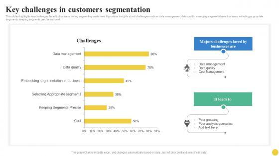 This slides highlights key challenges faced by business during segmenting customers. It provides insights about challenges such as data management, data quality, emerging segmentation in business, selecting appropriate segments, keeping segments precise and cost. Slidegeeks is one of the best resources for PowerPoint templates. You can download easily and regulate Key Challenges In Customers Segmentation Ppt File Deck PDF for your personal presentations from our wonderful collection. A few clicks is all it takes to discover and get the most relevant and appropriate templates. Use our Templates to add a unique zing and appeal to your presentation and meetings. All the slides are easy to edit and you can use them even for advertisement purposes.