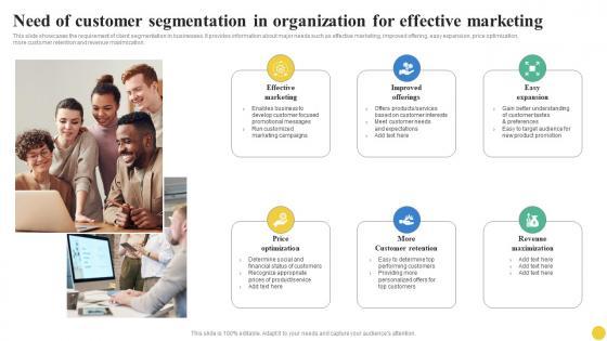 This slide showcases the requirement of client segmentation in businesses. It provides information about major needs such as effective marketing, improved offering, easy expansion, price optimization, more customer retention and revenue maximization. There are so many reasons you need a Need Of Customer Segmentation In Organization Successful Guide For Market Segmentation Elements Pdf. The first reason is you can not spend time making everything from scratch, Thus, Slidegeeks has made presentation templates for you too. You can easily download these templates from our website easily. This slide showcases the requirement of client segmentation in businesses. It provides information about major needs such as effective marketing, improved offering, easy expansion, price optimization, more customer retention and revenue maximization.
