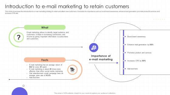 This slide showcases the introduction to e-mail strategy to create retain old customers. It includes its importance such as enhance lead generation, CTR rate and promotes product and services. Slidegeeks is here to make your presentations a breeze with Introduction To E-Mail Marketing To Retain Customers Professional PDF With our easy-to-use and customizable templates, you can focus on delivering your ideas rather than worrying about formatting. With a variety of designs to choose from, you are sure to find one that suits your needs. And with animations and unique photos, illustrations, and fonts, you can make your presentation pop. So whether you are giving a sales pitch or presenting to the board, make sure to check out Slidegeeks first