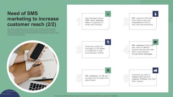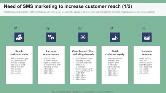 This slide represents the importance of SMS marketing in generating more revenue and sales for the organization. It includes details related to need of SMS marketing in increasing customer reach and response rate etc. This Need Of SMS Marketing To Increase Customer Text Message Marketing Strategies Demonstration Pdf from Slidegeeks makes it easy to present information on your topic with precision. It provides customization options, so you can make changes to the colors, design, graphics, or any other component to create a unique layout. It is also available for immediate download, so you can begin using it right away. Slidegeeks has done good research to ensure that you have everything you need to make your presentation stand out. Make a name out there for a brilliant performance. This slide represents the importance of SMS marketing in generating more revenue and sales for the organization. It includes details related to need of SMS marketing in increasing customer reach and response rate etc.
