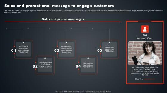 This slide represents the campaign organized by customers to drive brand awareness and to increase the sales of companys products and services. It includes details related to sales and promotional message sent to customers in order to engage them. This Sales And Promotional Message To Engage Customers Ppt PowerPoint Presentation File Example File PDF from Slidegeeks makes it easy to present information on your topic with precision. It provides customization options, so you can make changes to the colors, design, graphics, or any other component to create a unique layout. It is also available for immediate download, so you can begin using it right away. Slidegeeks has done good research to ensure that you have everything you need to make your presentation stand out. Make a name out there for a brilliant performance.