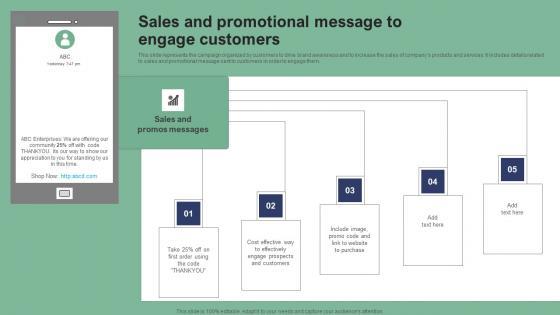 This slide represents the campaign organized by customers to drive brand awareness and to increase the sales of companys products and services. It includes details related to sales and promotional message sent to customers in order to engage them. This Sales And Promotional Message To Engage Customers Ppt PowerPoint Presentation File Diagrams PDF from Slidegeeks makes it easy to present information on your topic with precision. It provides customization options, so you can make changes to the colors, design, graphics, or any other component to create a unique layout. It is also available for immediate download, so you can begin using it right away. Slidegeeks has done good research to ensure that you have everything you need to make your presentation stand out. Make a name out there for a brilliant performance.