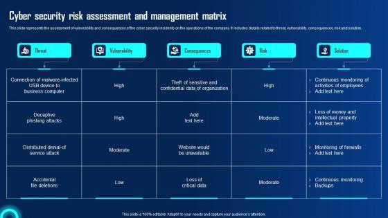 This slide represents the assessment of vulnerability and consequences of the cyber security incidents on the operations of the company. It includes details related to threat, vulnerability, consequences, risk and solution. Welcome to our selection of the CYBER Security Breache Response Strategy Cyber Security Risk Assessment And Management Matrix Diagrams PDF. These are designed to help you showcase your creativity and bring your sphere to life. Planning and Innovation are essential for any business that is just starting out. This collection contains the designs that you need for your everyday presentations. All of our PowerPoints are 100 percent editable, so you can customize them to suit your needs. This multi purpose template can be used in various situations. Grab these presentation templates today.