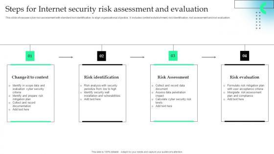 This slide showcase cyber risk assessment with standard risk identification to align organizational objective . It includes context establishment, risk identification, risk assessment and risk evaluation. Showcasing this set of slides titled Steps For Internet Security Risk Assessment And Evaluation Microsoft Pdf The topics addressed in these templates are Risk Identification, Risk Assessment, Risk Evaluation All the content presented in this PPT design is completely editable. Download it and make adjustments in color, background, font etc. as per your unique business setting. This slide showcase cyber risk assessment with standard risk identification to align organizational objective . It includes context establishment, risk identification, risk assessment and risk evaluation.